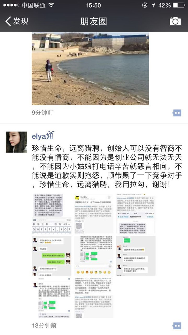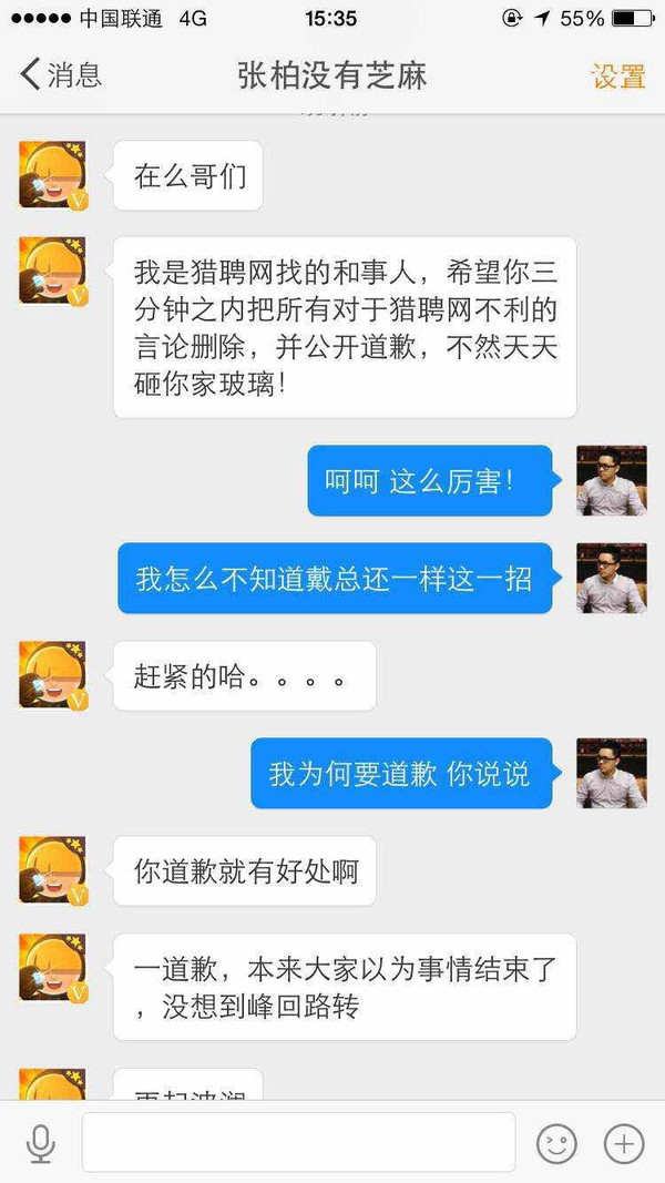 猎聘网的人也别再找相关人员算账了,我不想继续曝光你们的行径,“请自重”。做错了事情就要立正挨打,诚恳道歉很难吗?