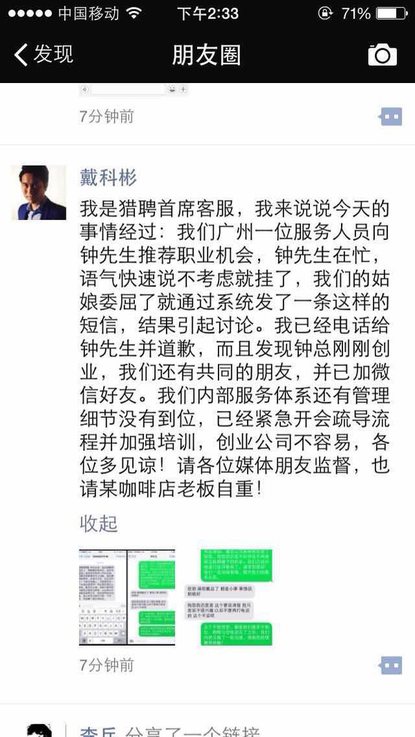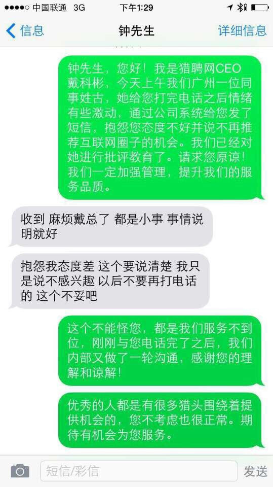 紧接着,猎聘网CEO戴先生火速召开救火会议商量如何危机公关。以下是钟先生和戴先生的短信对话截屏。