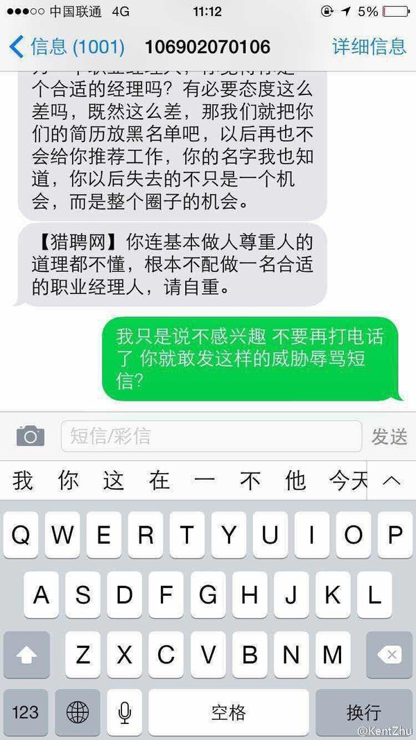 这时我才知道,原来是因为猎聘网的客服给钟先生打电话推荐工作机会,被钟先生快速回绝。客服觉得钟先生回绝态度恶劣(有可能正在和VC meeting呢),心有余气,于是通过猎聘网的系统账号给张先生发送了如上二图的消息,可能觉得说完第一段话还不够解气顺势又补了一刀,说出:“你连基本做人尊重人的道理都不懂,根本不配做一名合适的职业经理人,请自重”这样的重话。我觉得能给职业经理人介绍工作机会的客服,好带也是senior级别的客服吧?有什么不爽暗地里骂娘,默默拉黑不就完了,非要选取这么极端的方式毁掉自己的职业生涯。现在短信和微信类似以前邮箱的功能,可以用于留底,在这个互联网极其发达的时代,任何公开的言论都有可能给公司给自己带来灭顶之灾。